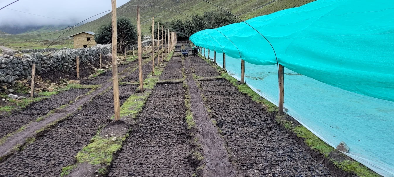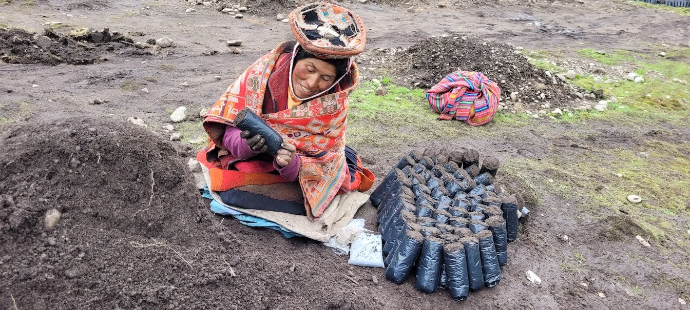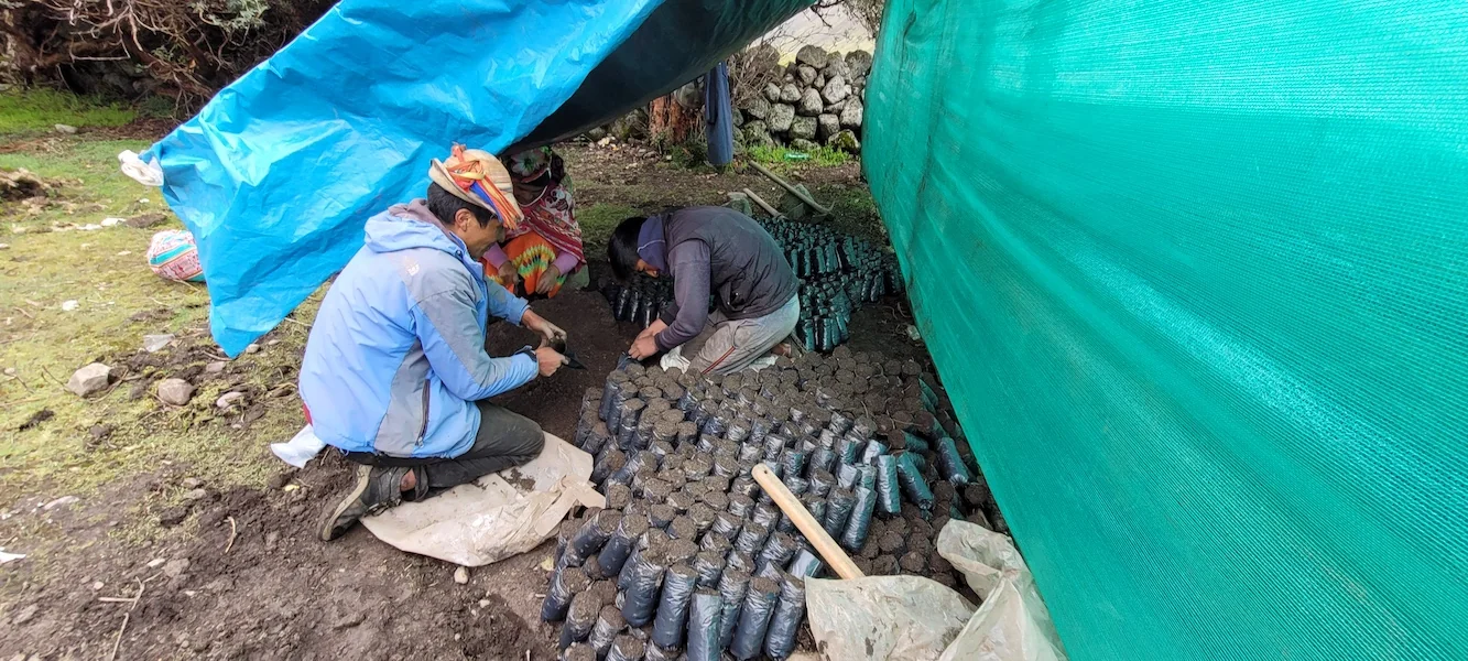 We gaan meteen naar de boomkwekerij waar Ricardo, de verantwoordelijke, in de stromende regen met geregeld hagel tussendoor, aan het werk is met tien families. Het is er steenkoud! Ik maak een rondje langs alle families om te horen of alles goed gaat. Julio heeft het geld bij zich om aan de families te betalen. De families zijn aan het werk met het planten van de pijnbomen en om aarde in de zakjes te doen.