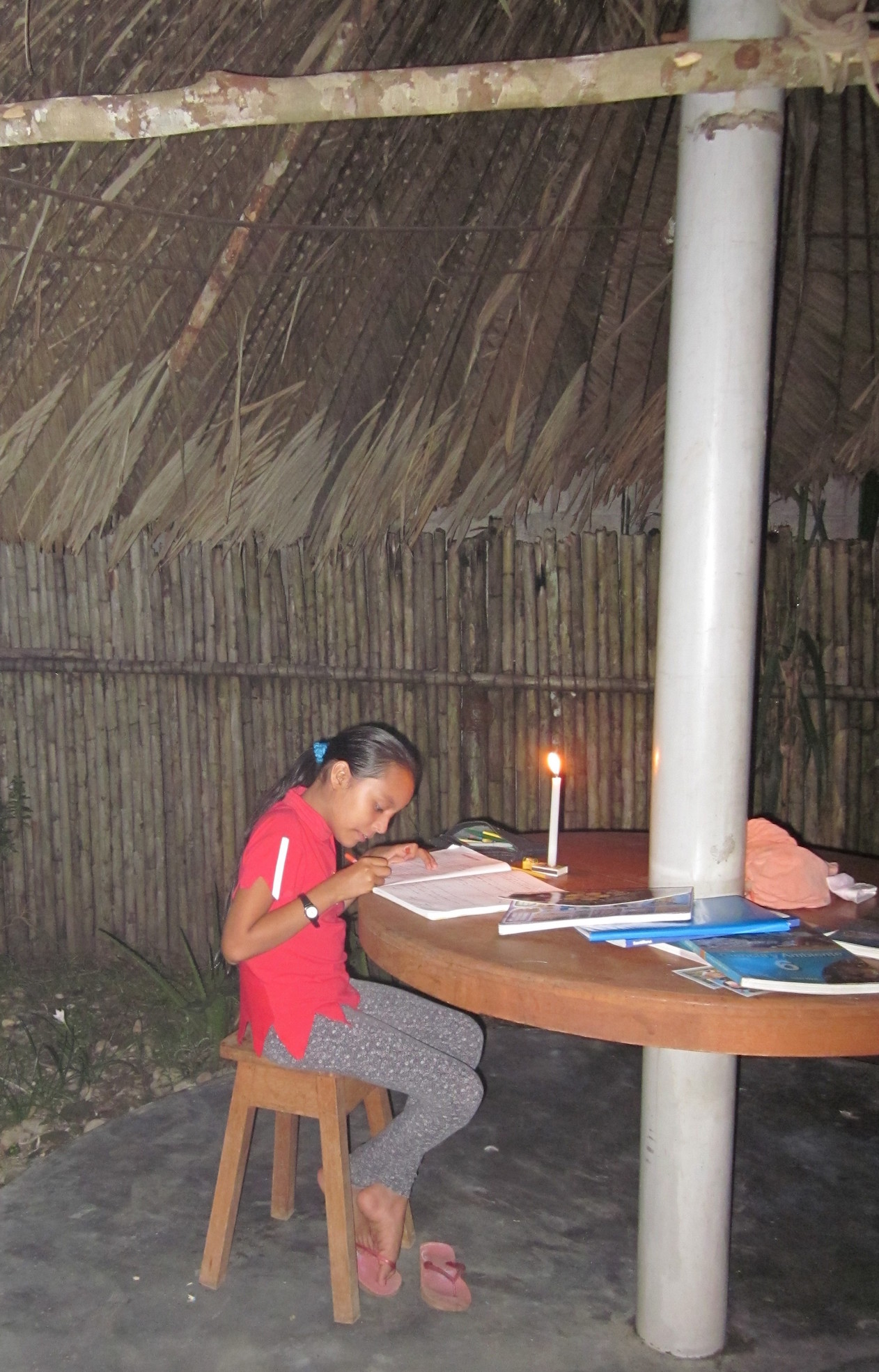 Dit tafereel deed me denken aan een andere foto die ik nog niet zo lang geleden van mijn dochter kreeg. Zij fotografeerde haar zusje in Perú ook tijdens het maken van haar huiswerk in wat primitievere omstandigheden.
